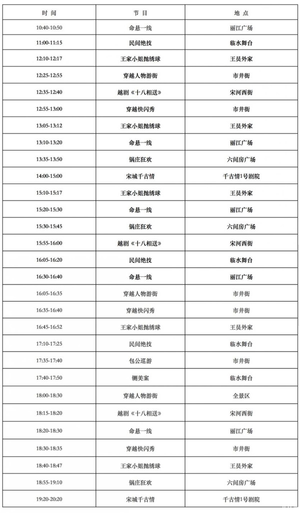 第五場:18:30-19:30第六場:19:00-20:00第七場:20:00-21:002、演出所在命懸一線的所在為麗江廣場;民間絕技的所在為臨水舞臺;招婿拋繡球所在為王員外家;穿越快閃秀的所在為市井街;