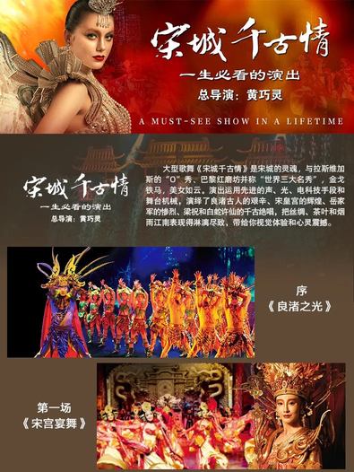 越劇《十八相送》的所在為宋河西街;鍋莊狂歡的所在為六間房廣場3、演出表如果宋城熱鬧的街景還有街頭精彩的演出你很喜歡的話,那么不要著急,宋城的演出可不只是和么一點點,宋城的千古情演出肯定是要去看的,很多去玩宋城的游客都是為了千古情演出來的。