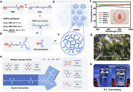 近日,學(xué)院吳錦榮教授團(tuán)隊報道了一種室溫下能快速修復(fù)的玻璃態(tài)超支化聚氨酯(UGPU)在這項工作中,研究人員通過偶聯(lián)單體法反應(yīng)得到了具有無環(huán)雜原子鏈和發(fā)泡超支化結(jié)構(gòu)的聚氨酯質(zhì)料(圖1)這種獨(dú)特的分子結(jié)構(gòu)將超支化聚合物的高分子運(yùn)動性與聚氨酯的多重氫鍵相結(jié)合,構(gòu)成了基于脲鍵、氨基甲酸酯鍵和支化末端羥基的高密度氫鍵網(wǎng)絡(luò)。