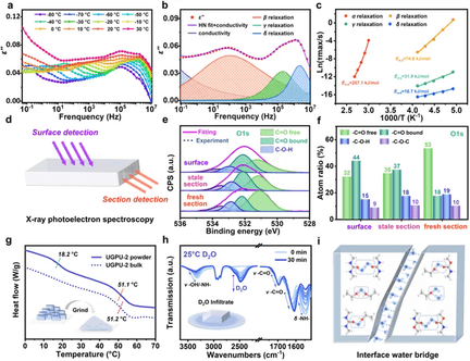 圖2 UGPU的室溫超快速修復(fù)性能為了揭示UGPU的快速修復(fù)的機(jī)理,研究人員通過寬頻介電松弛譜、X射線光電子能譜、二維紅外光譜、時間相關(guān)紅外光譜和顯微紅外光譜等一系列手段,解析UGPU超快速修復(fù)的內(nèi)在機(jī)制(圖3),該機(jī)制主要體現(xiàn)在: