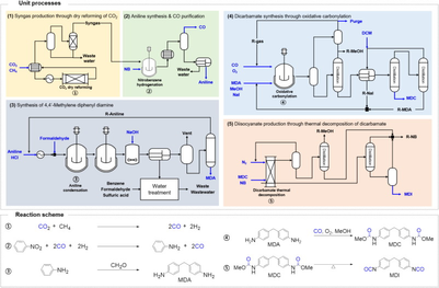 韓國化學技術研究院 (KRICT)的研究人員提出了一種合成二苯基甲烷二異氰酸酯 (MDI)的可連續工藝該工藝利用CO2生產合成氣,然后通過加氫反應分離合成氣,胺的氧化羰基化形成4,4-二苯甲烷二氨基甲酸甲酯(MDC),然后熱分解產生MDI。