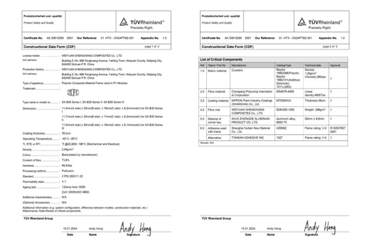 本次認證的系列聚氨酯光伏邊框制品,通過了德國萊茵TüV 公司2PfG2923尺度認證,在耐老化測試、阻燃性能、力學性能、耐鹽霧測試等全周期測試中體現優異,該證書的獲得是對威遠盛祥復合原料有限公司高質量制造能力的認可。
