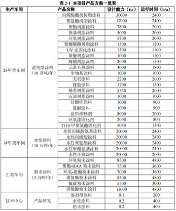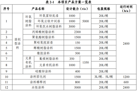 項(xiàng)目建成后,年產(chǎn) 5000 噸環(huán)氧樹(shù)脂涂料、2300 噸丙烯酸樹(shù)脂涂料自結(jié)皮、1500 噸聚氨酯樹(shù)脂涂料、150 噸聚硅氧烷面漆、1500 噸醇酸樹(shù)脂涂料、500 噸橡膠涂料、1350 噸元素有機(jī)涂料、1500 噸涂料固化劑、800 噸涂料稀釋劑、400 噸硅酸鋅涂料、5000 噸水性涂料。