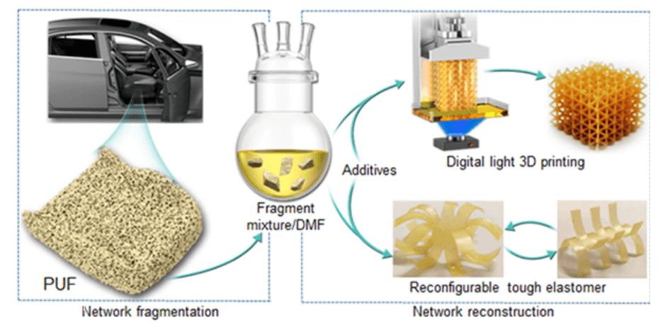 在國(guó)家自然科學(xué)基金項(xiàng)目(批準(zhǔn)號(hào):52033009)等資助下,浙江大學(xué)化學(xué)工程與生物工程學(xué)院謝濤教授團(tuán)隊(duì)陳訴了一種將商業(yè)化熱固性聚氨酯泡沫高效降解與高值化利用的化學(xué)回收新計(jì)謀,將聚氨酯泡沫降解為聚合物片段,通過設(shè)計(jì)封端化學(xué),可以得到具有高附加值的高性能3D打印樹脂。