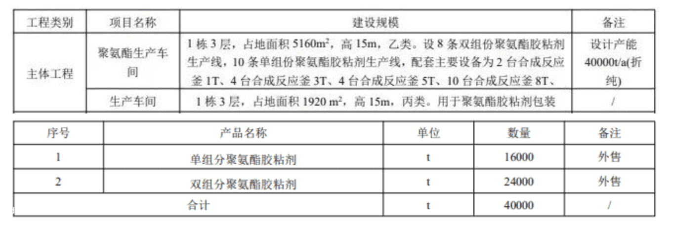 占地面積:本項目占地面積為 73333.3m2,合計 110 畝 發泡 建設規模:本次一期建設 10 萬噸環保型聚氨酯粘接密封膠,擬建 1 座綜合樓、2 座丙類堆棧、1 座乙類堆棧、1 座聚氨酯車間、1 座生產車間、1 座導熱油 爐房、1 座配電房、1 座機柜間、1 座生產輔助用房、1 座控制室、1 座丙類罐區及其它生產輔助設施。