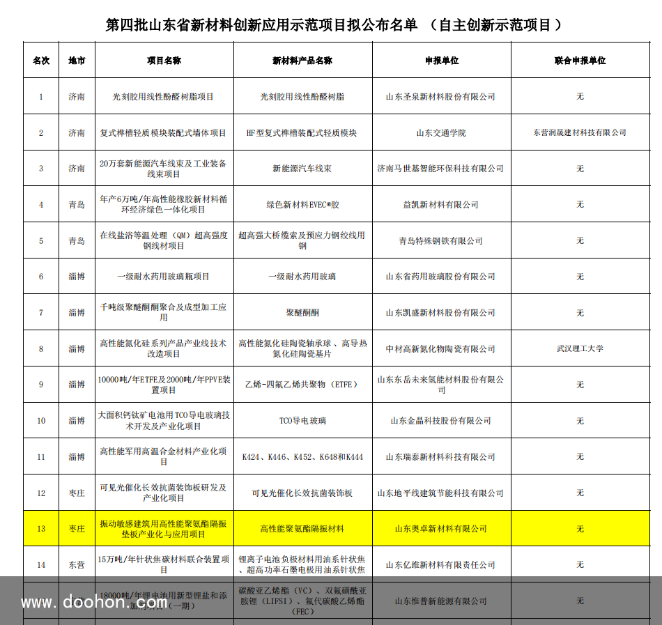 名單山東奧卓新原料“高性能聚氨酯隔振墊板項目聚氨酯”入選山東省新原料創新應用示范項目公示名單